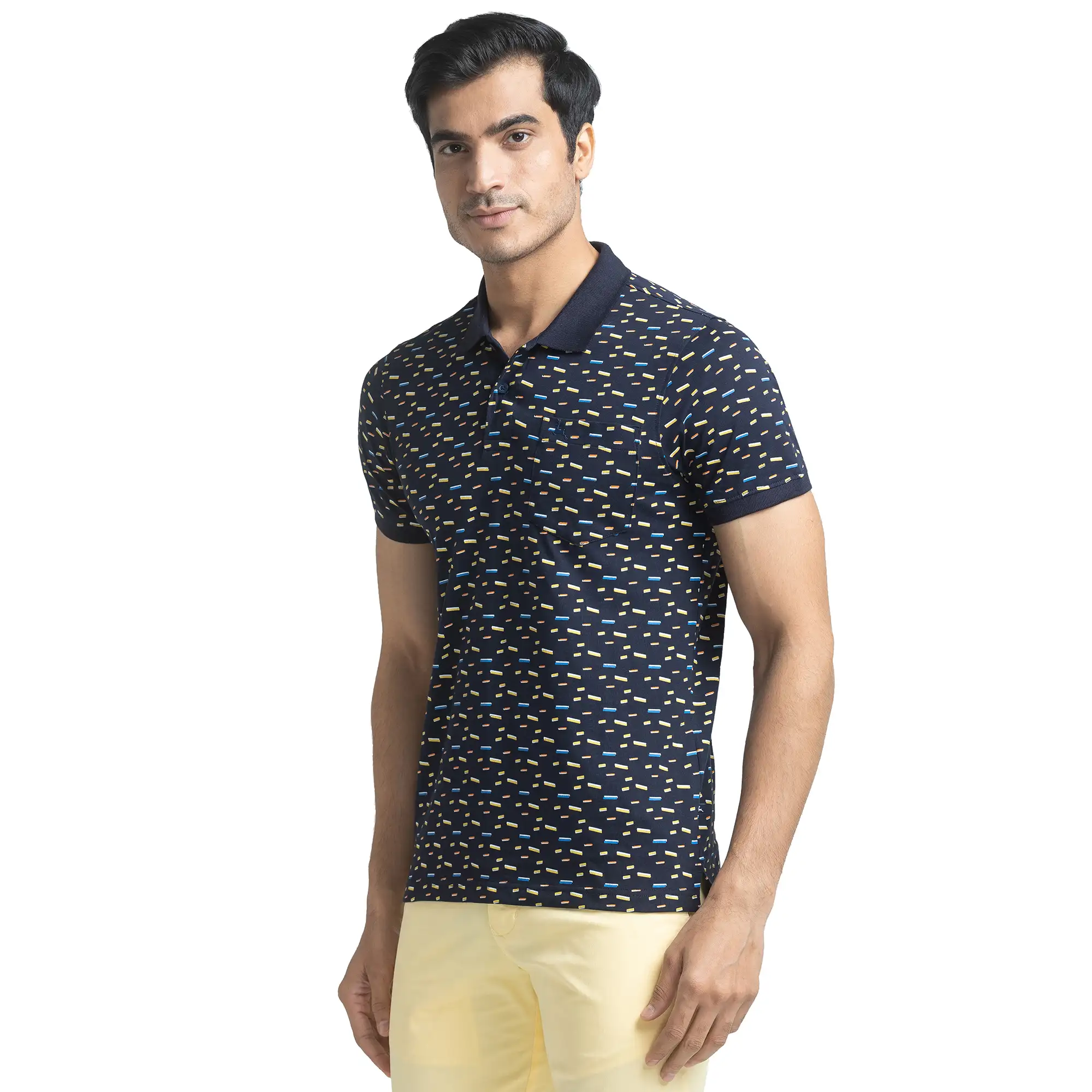 Men Blue Regular Fit Print Cotton Round Neck Collar Polo T-Shirt—