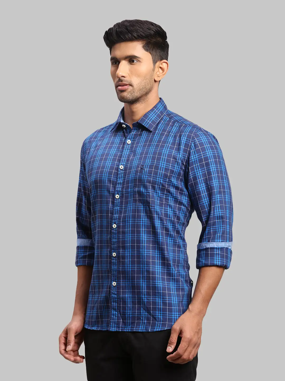 Men Blue Slim Fit Checks Cotton Blend Full Sleeve Shirts