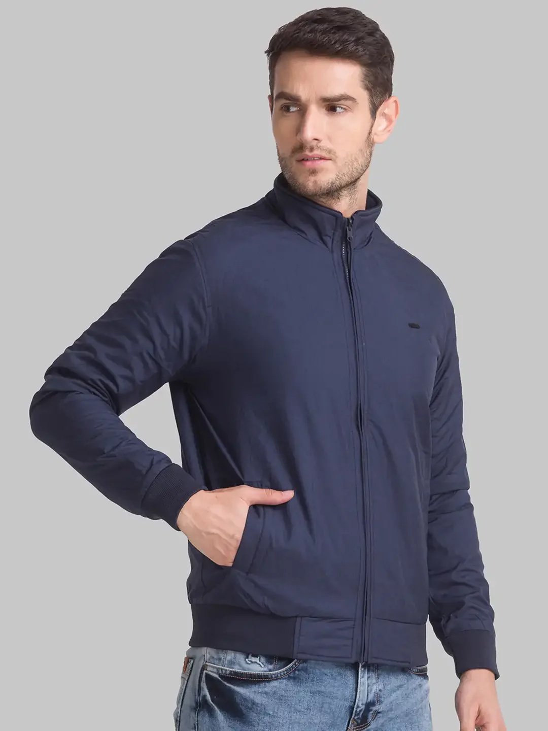 Men Blue Solid Polyester Full Sleeve Jackets