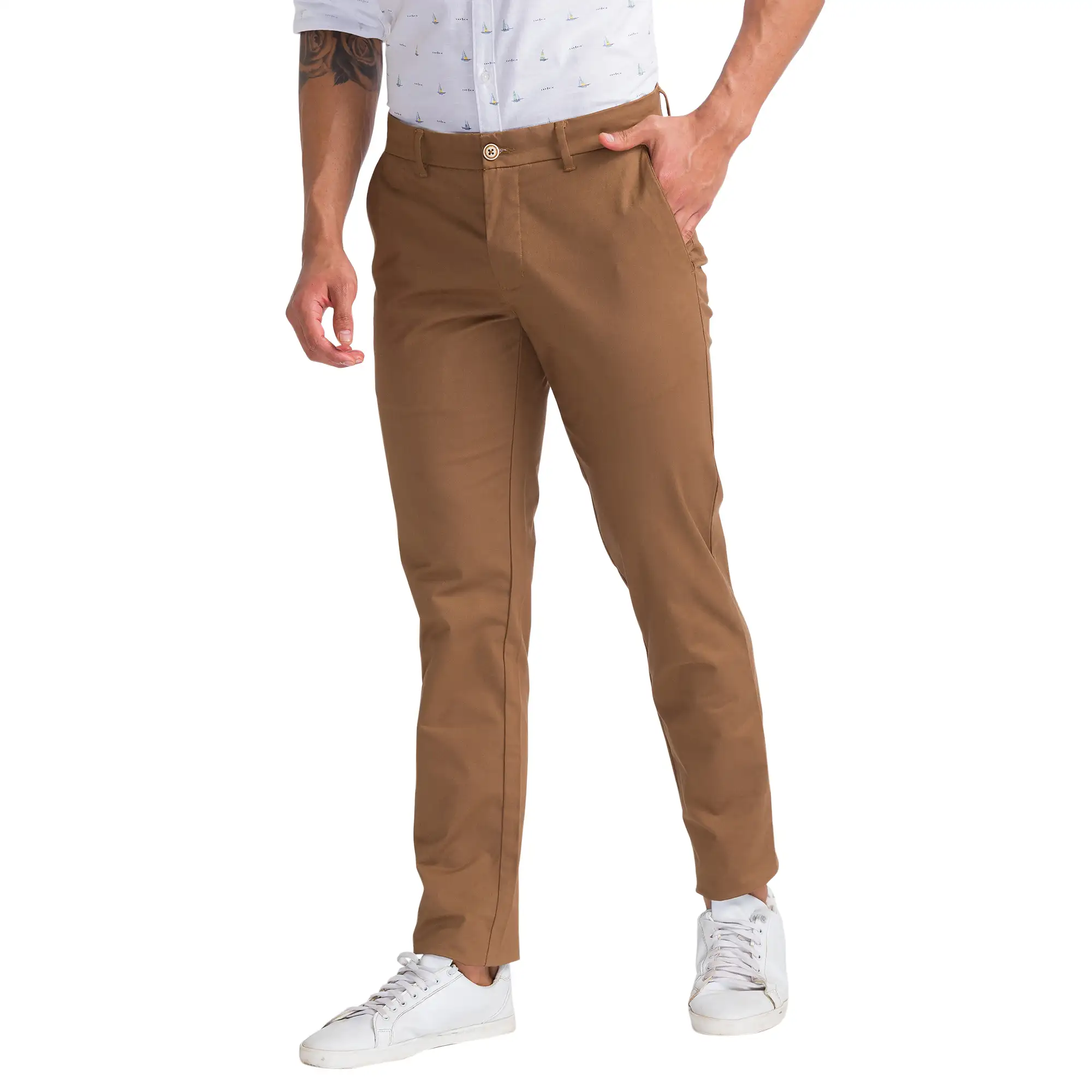 Men Brown Low Rise Tapered Fit Solid Cotton Blend Trouser