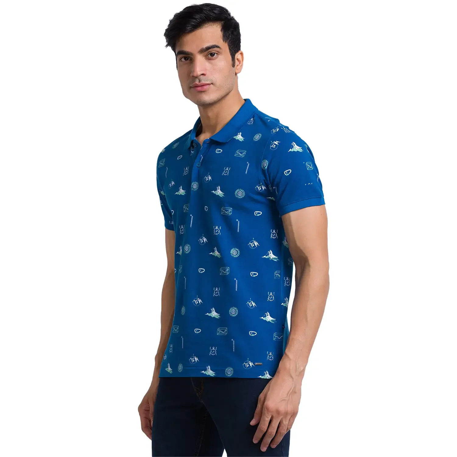 Men Petrol Regular Fit Print Cotton Round Neck Collar Polo T-Shirt