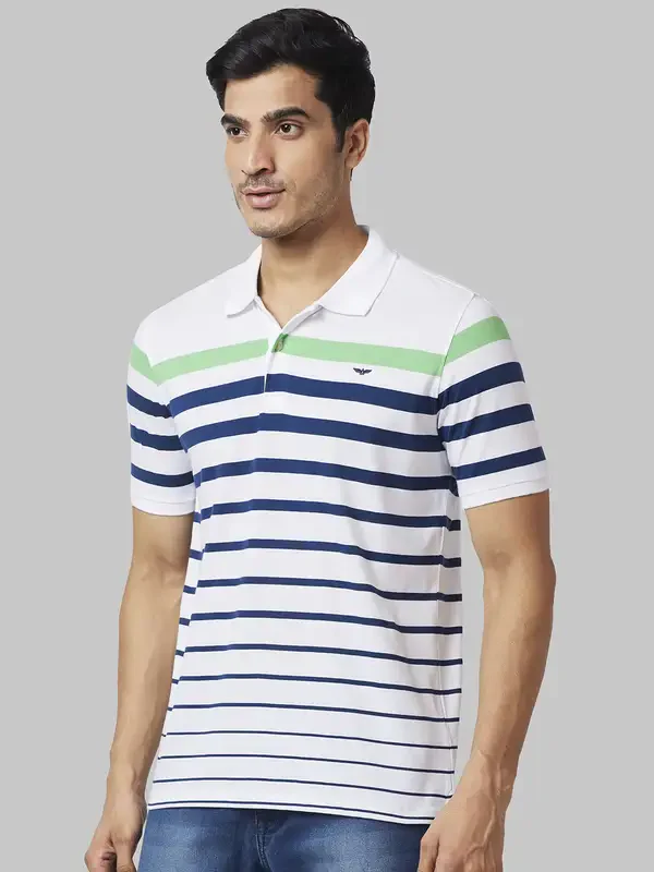 Men White Slim Fit Stripe Cotton Polyester Blend Round Neck Collar Polo T-Shirt