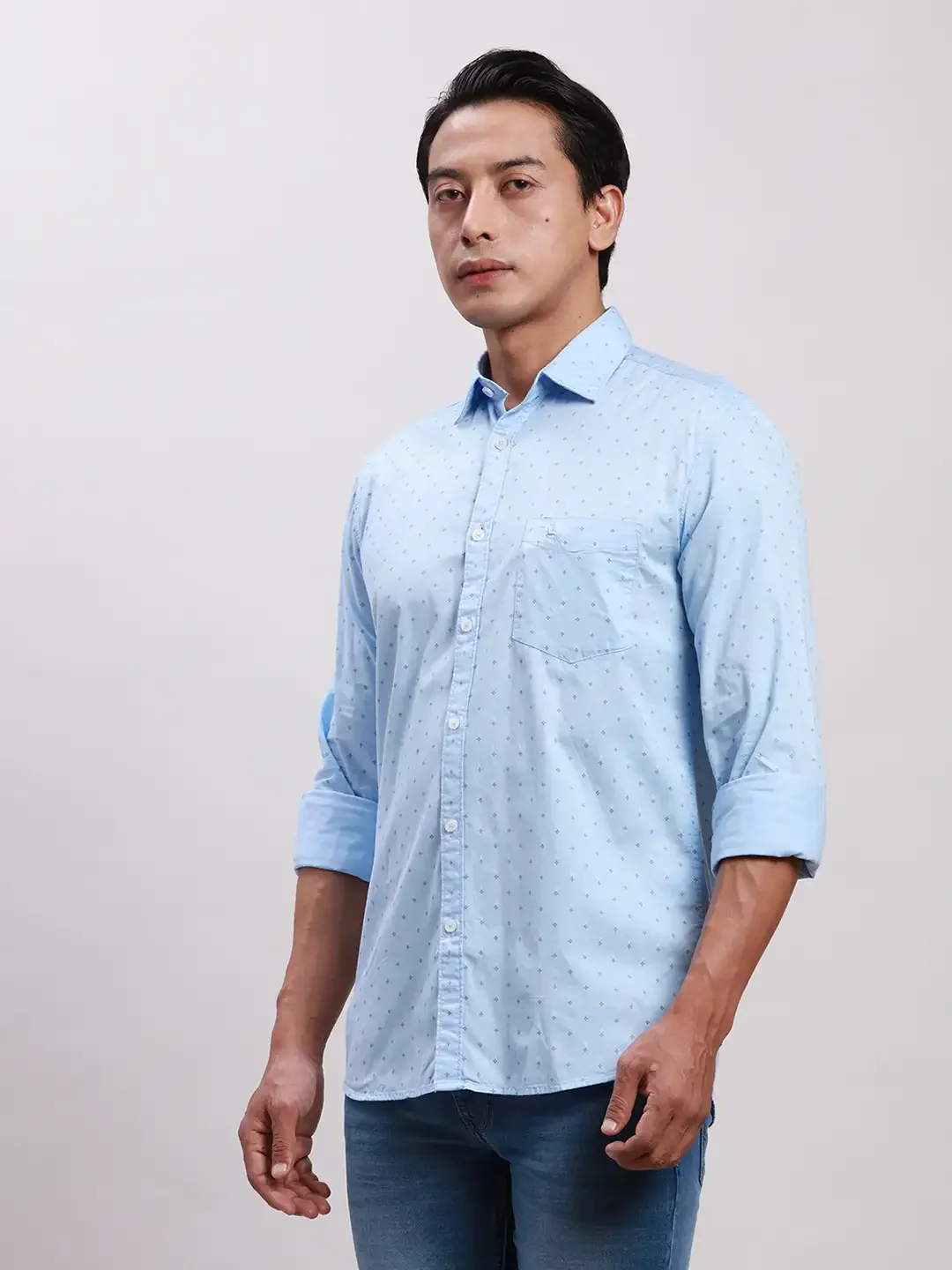 Refresh your style with the Parx Men Blue Slim Fit Printed Cotton Full Sleeve Cut Away Shirt!