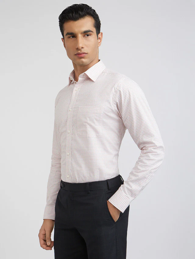 Make a stylish statement with the Raymond Men Pink Structure Slim Fit Cotton Shirt. This shirt features a rich pink hue and a modern structure pattern, offering a sophisticated and contemporary look. The slim fit design ensures a sharp and tailored silhouette, perfect for both formal and semi-formal occasions. Crafted from soft and breathable cotton, this shirt guarantees all-day comfort. Whether you're dressing for a special event or looking to add a pop of color to your workwear, this pink structured shirt is the ideal choice.